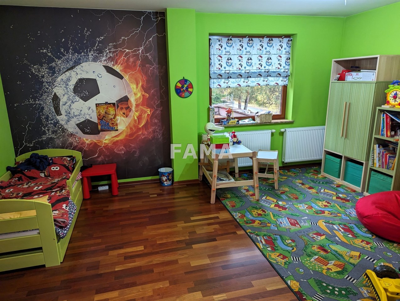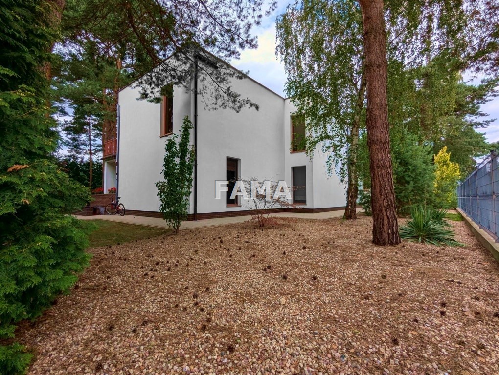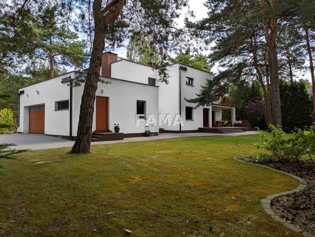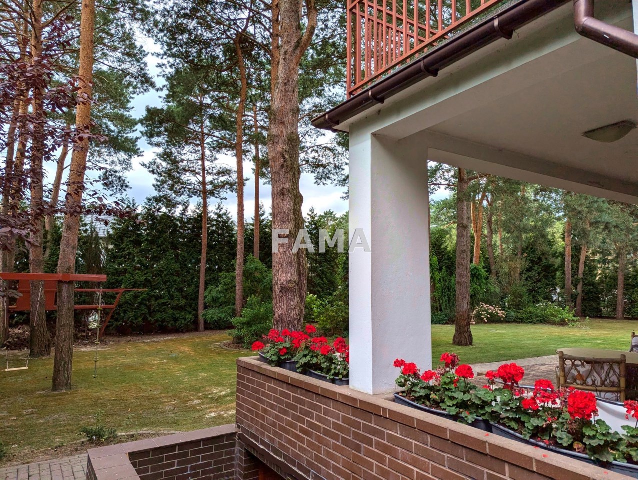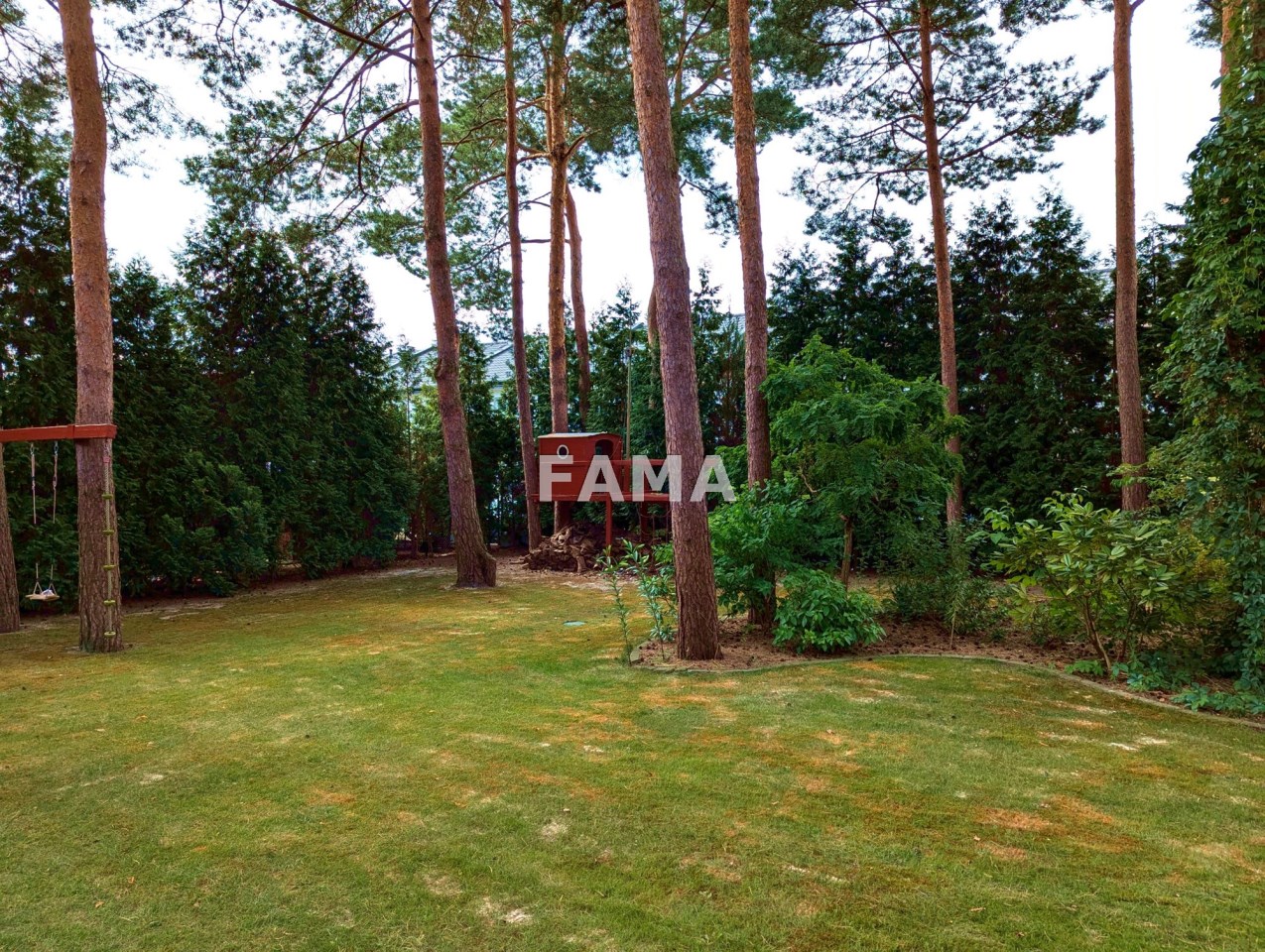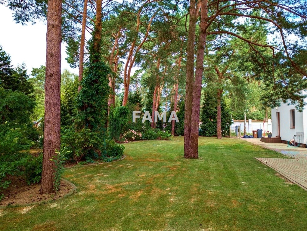 Piękna działka o powierzchni 1556 mkw, w kształcie kwadratu, o wymiarach 39,3 m x 39,5 m, z majestatycznymi sosnami, zadbanym trawnikiem, z posadzonymi kwiatami, krzewami, iglakami, teren wokół domu i podjazd do garażu wyłożony kostka brukową, ogrodzona panelami z siatki metalowej. Dojazd drogą asfaltową.