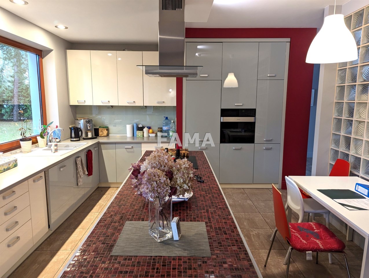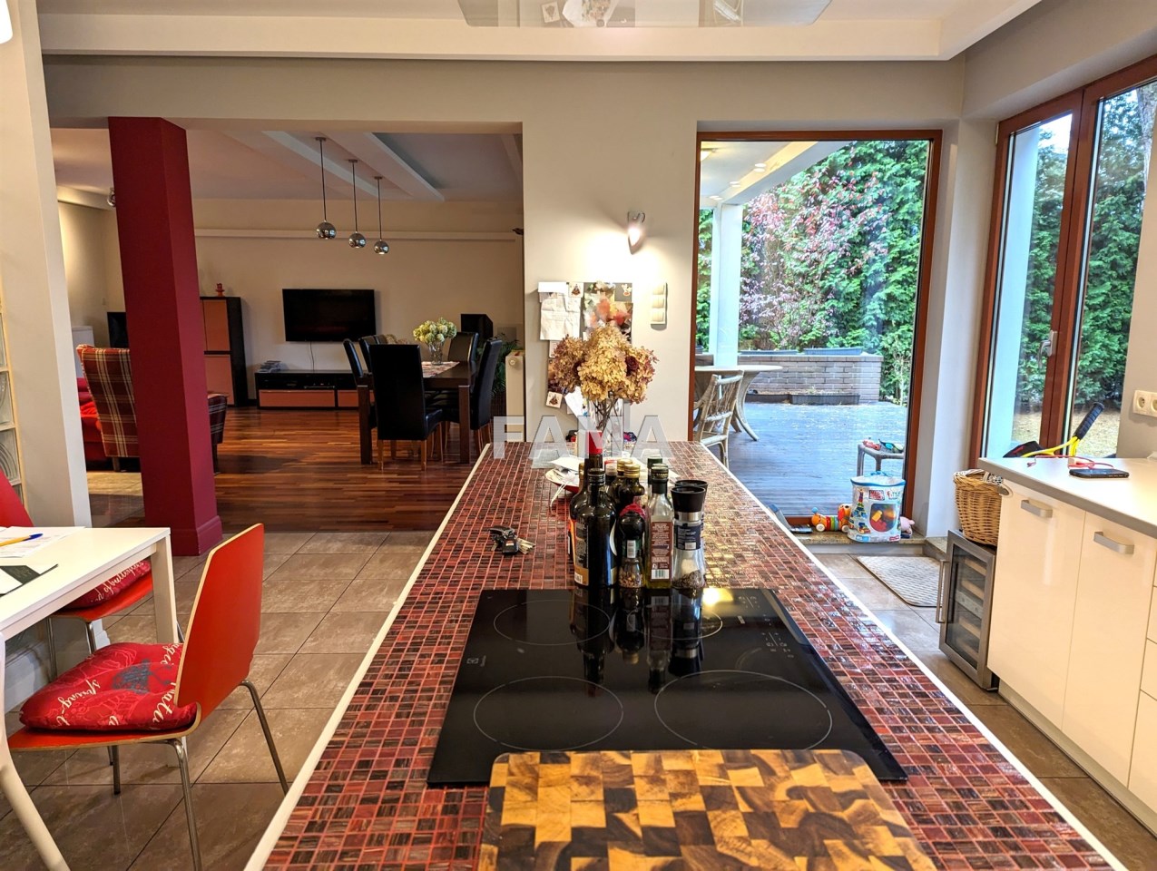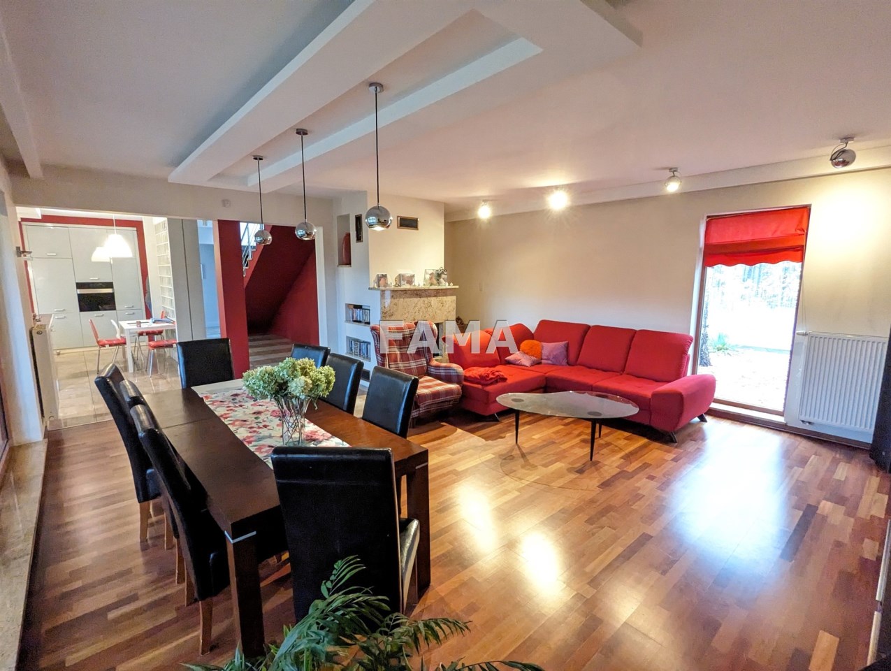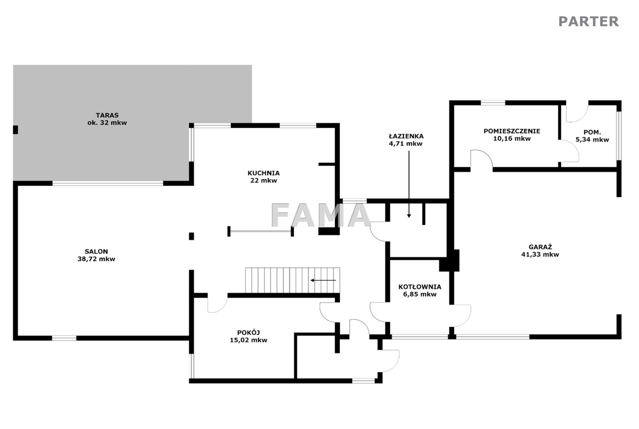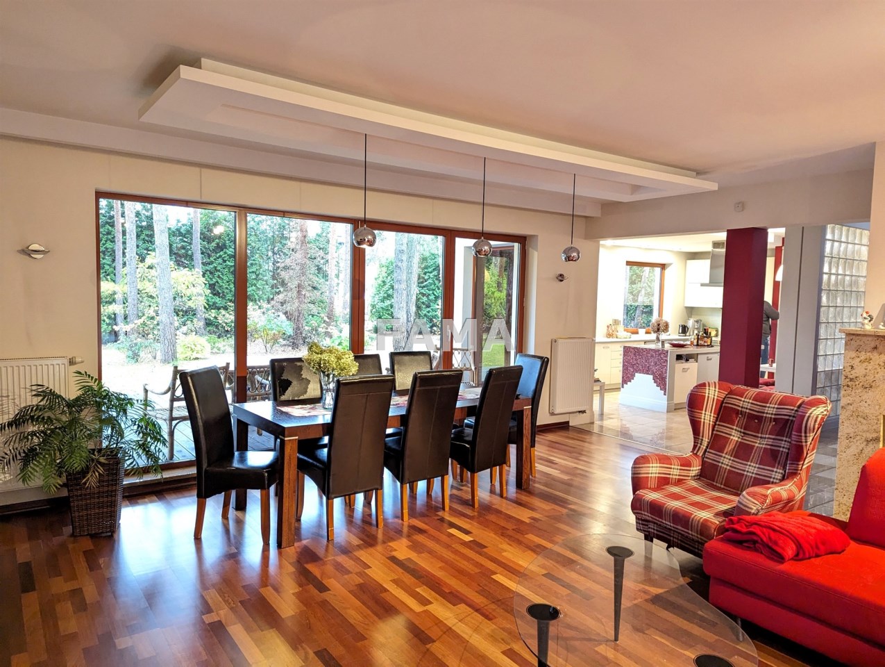 Na parterze, o wysokości pomieszczeń 2,73 m, doskonale naświetlony salon o powierzchni 38,72 mkw, z przeszkoloną w 3/4 ścianą od strony tarasu, z kominkiem, połączony z dużą – 22 mkw – kuchnią, z wyspą, na której blacie położoną mozaikę Bisazza, także z wyjściem na taras z deskami modrzewiowymi, z jadalnią, pokój 15,02 mkw, łazienka 4,71 mkw – z kabiną, muszlą, umywalką -wiatrołap, przedpokój, kotłownia, z przejściem do garażu o powierzchni 41,33 mkw, oraz, obok garażu, dwa pomieszczenia o powierzchniach 10,16 mkw i 5,34 mkw, przewidziane na ewentualny gabinet z poczekalnią dla pani lub pana domu, z wejściem z garażu i drugim, niezależnym, z zewnątrz.