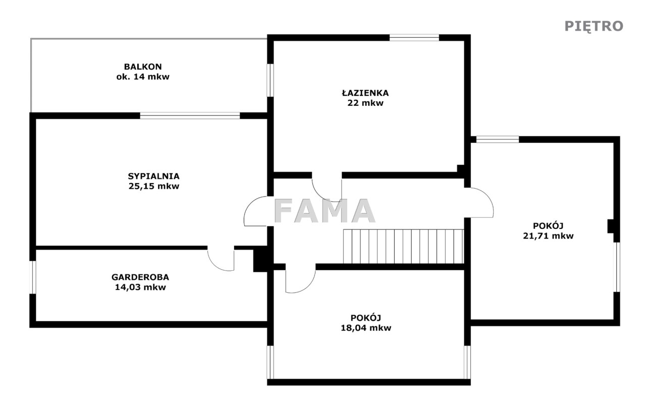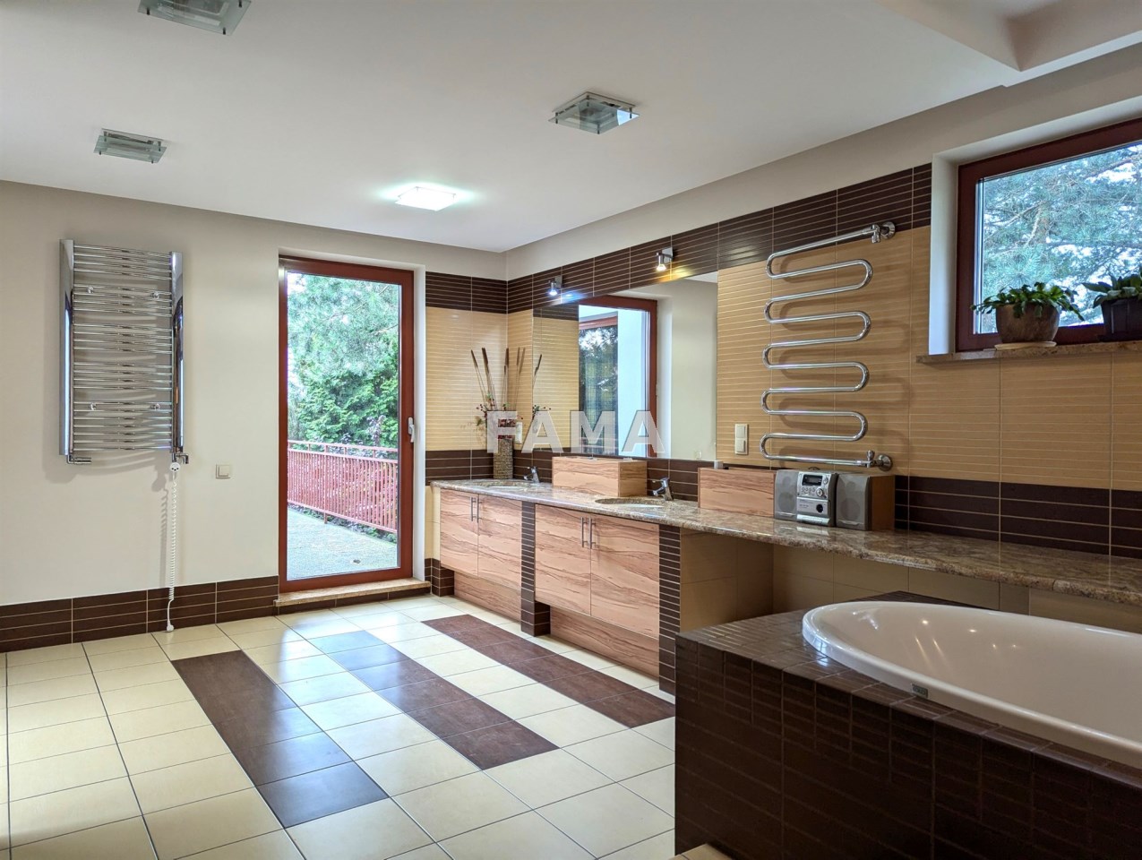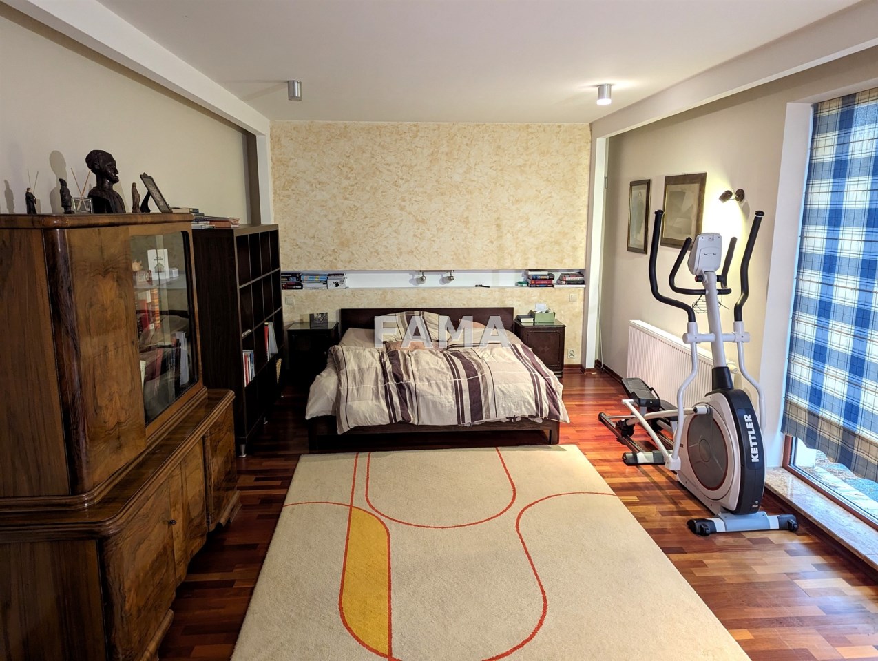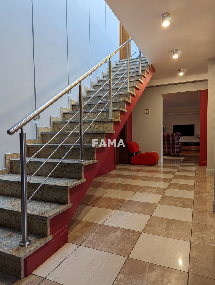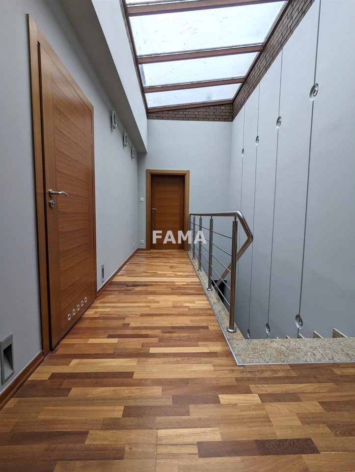 Na piętrze, o wysokości 2,56 m, na które prowadzą łagodne schody granitowe z balustradami ze stali nierdzewnej, mieści się jasny przedpokój z dużym świetlikiem w dachu, pokój 18,04 mkw, pokój 25,15 mkw, z wyjściem na duży balkon, z garderobą obok 14,03 mkw, pokój 21,71 mkw oraz bogato wykończona i wyposażona łazienka z wanną, kabiną prysznicową, umywalkami schowanymi w ponad 5 metrowy granitowy blat, muszlą, bidetem.
