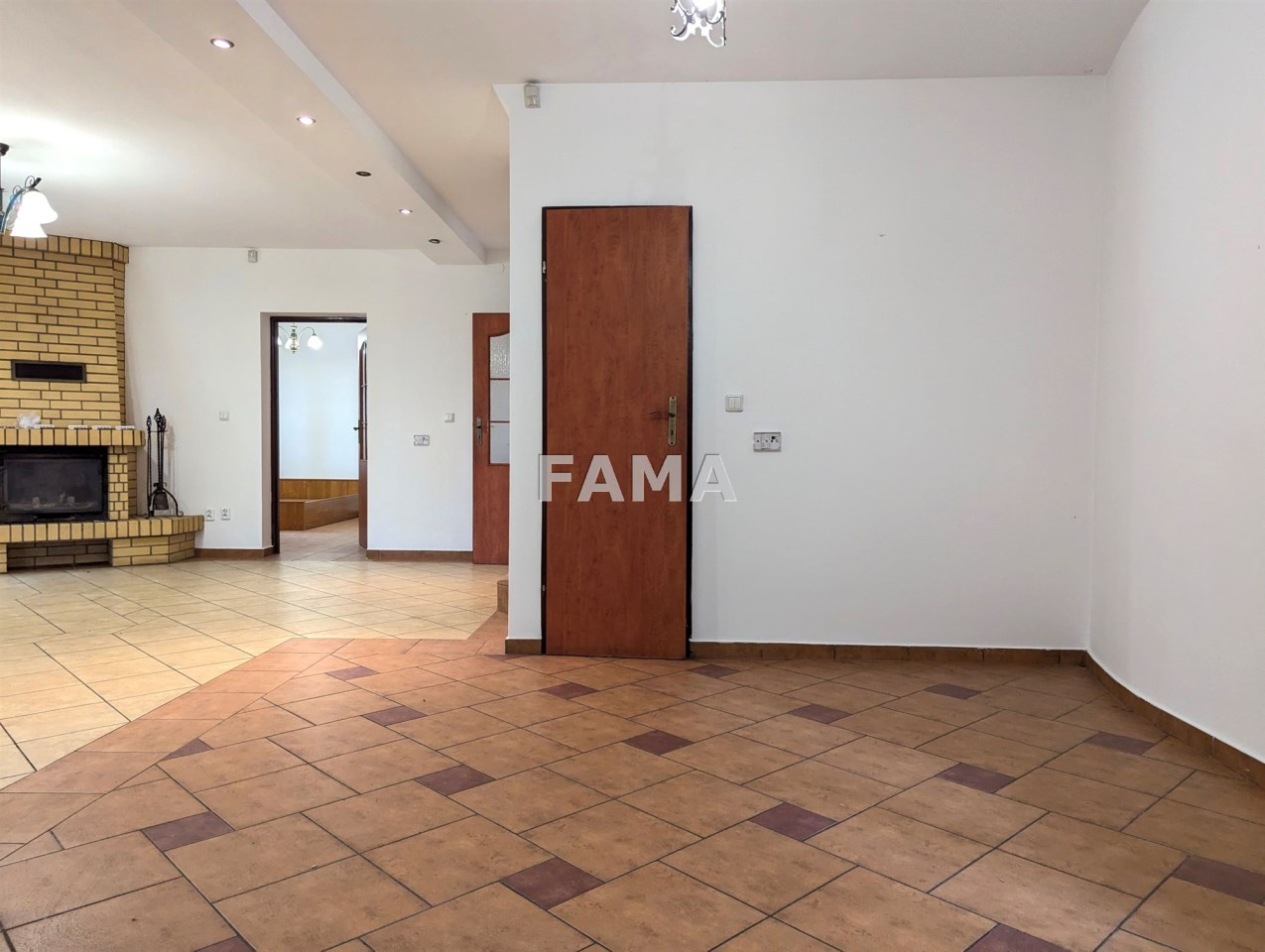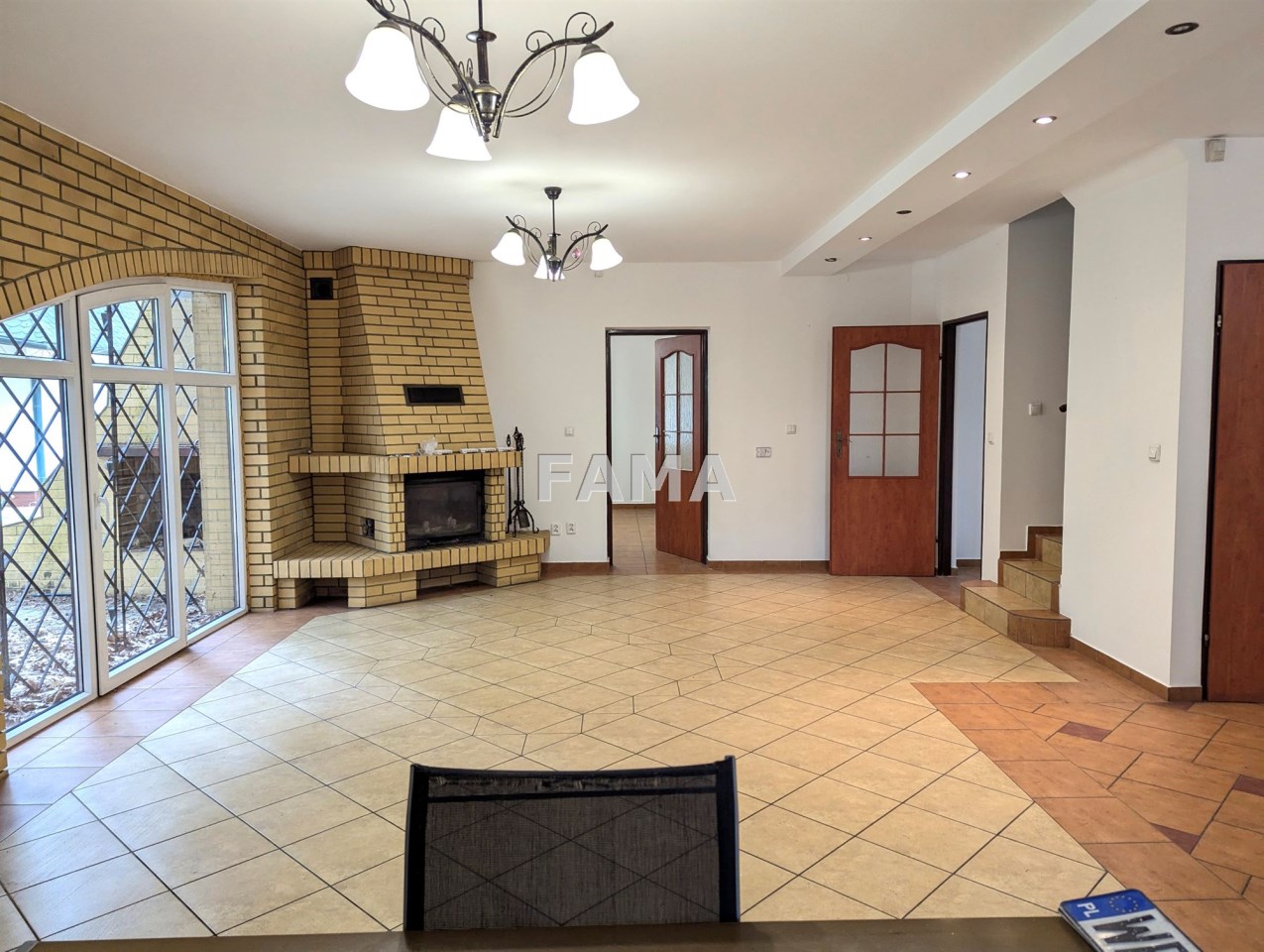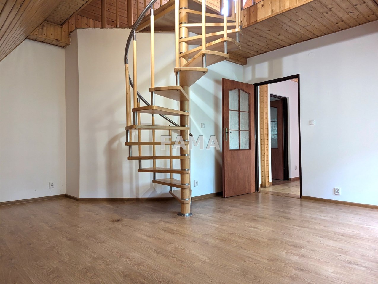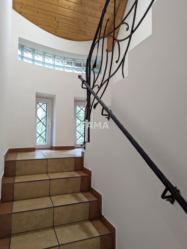 Na parterze pokój dzienny o powierzchni około 32 mkw, z kominkiem, z wyjściem na duży taras, kuchnia około 16 mkw (dodatkowo ze spiżarnią), pokój – 13,50 mkw z własną łazienką z oknem 4,4 mkw, hall, WC i wiatrołap; na poddaszu - 3 pokoje – o powierzchniach (zmierzonych po podłodze): 23,9 mkw (z dodatkowym pomieszczeniem strychowym, wchodząc po schodach spiralnych), 20,3 mkw i 18,59 mkw, duża łazienka z oknem 18 mkw, korytarz.