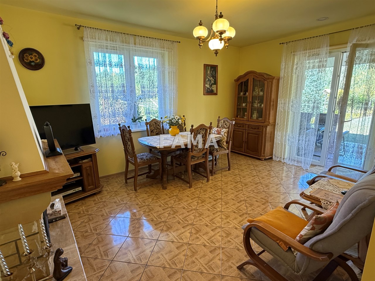 Całość gustownie i solidnie wykończona, w spokojnej tonacji beżów i brązów, okna PCW, na ścianach i sufitach gładź, na podłodze w całym domu terakota, w łazience – z WC i brodzikiem – glazura, terakota, w kuchni również płytki, dopasowana zabudowa meblowa, dwa zadaszone tarasy, od frontu i od strony ogrodowej, wyłożone ładnym gresem mrozoodpornym. Instalacja elektryczna miedziana, doprowadzona woda z sieci, odpływ do szamba ekologicznego.