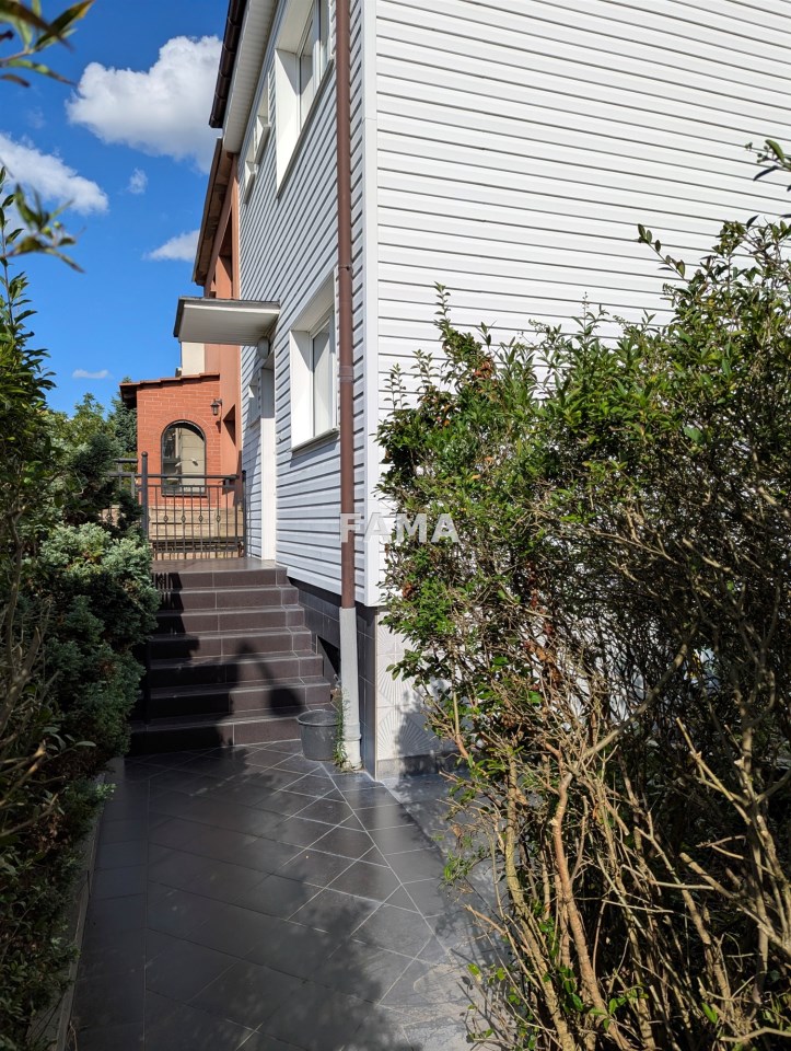 Fundamenty i chodniki wokół domu wyłożone gresem, wzdłuż jednej ściany bocznej duże, ozdobne kwietniki betonowe, nawierzchnia wjazdu do garażu z polbruku.
