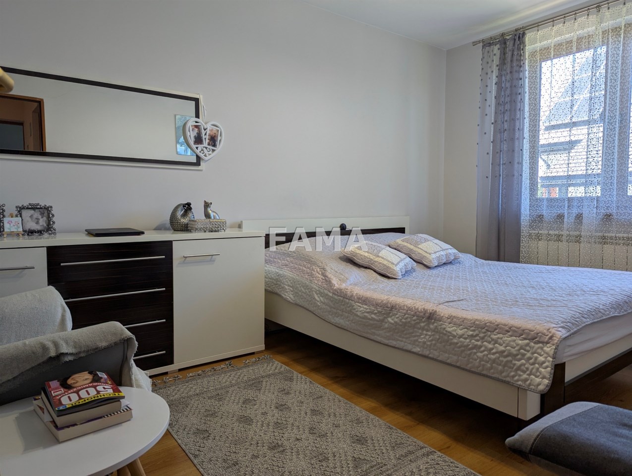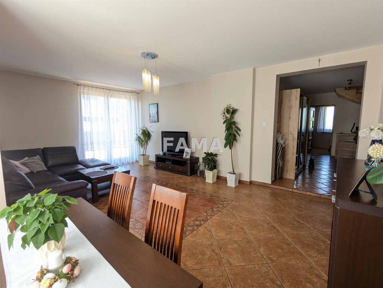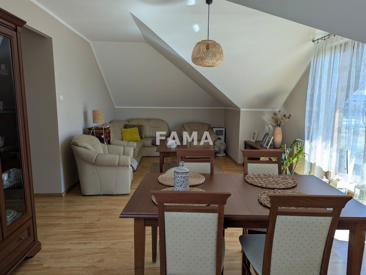 Z powodzeniem mogą w nim zamieszkać dwie rodziny, na parterze: salon - 27,58 mkw, z wyjściem na taras, z rozświetlającym wykuszem, kuchnia - 11,36 mkw, 3 pokoje – 12,82 mkw, 12,52 mkw, 10,52 mkw, łazienka - 5,67 mkw, hall - 17,84 mkw, garaż - 21,94 mkw, łazienka obok garażu - 5,11 mkw, ganek, kotłownia,