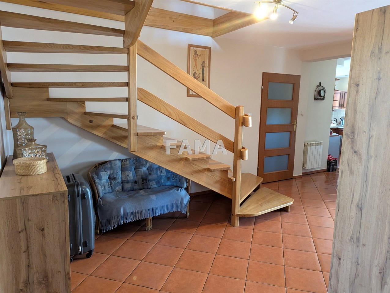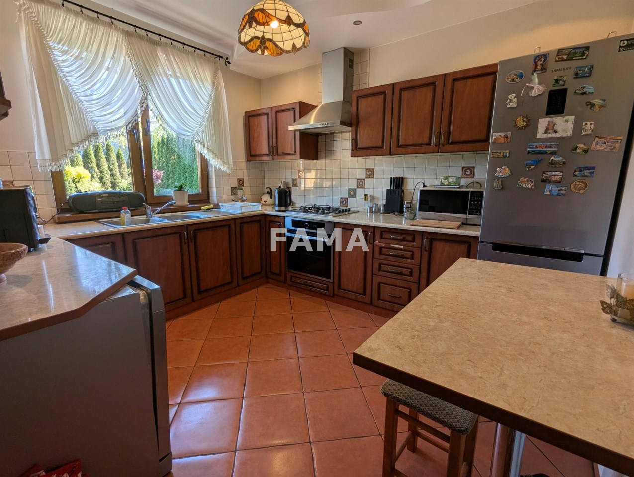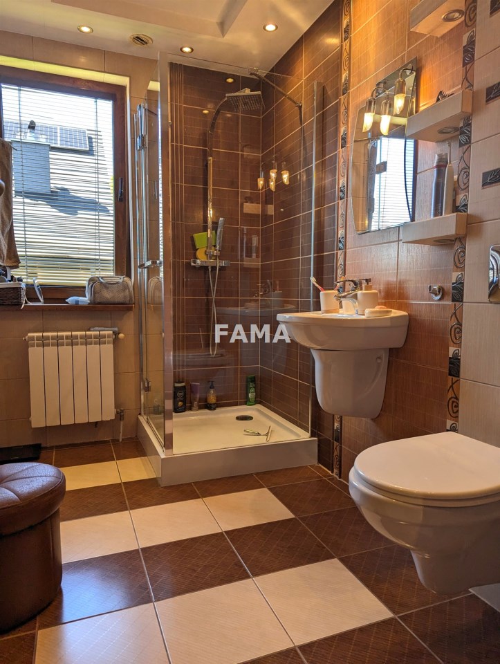 Całość wykończona, do zamieszkania: okna PCW, na ścianach i sufitach gładź, w pokojach na podłodze panele, w salonie kasztanowa terakota z atrakcyjnym dekorem pośrodku, w kuchniach i łazienkach – glazura, terakota w brązowej tonacji, rozświetlona jasnymi akcentami, meble w zabudowie, podwieszane sufity z oświetleniem ledowym, z parteru na poddasze wiodą ładne, lekkie schody drewniane, w przedpokoju szafa z drzwiami przesuwnymi, z lustrami, drzwi do garażu otwierane automatycznie.
