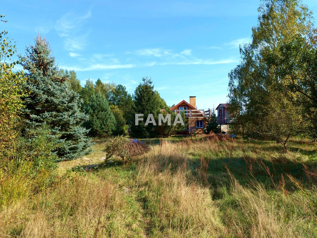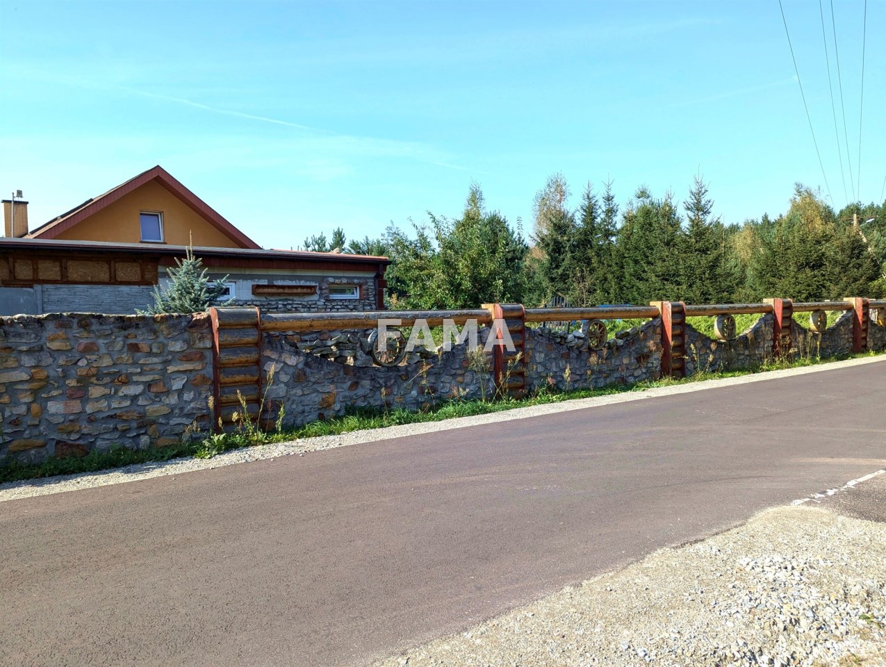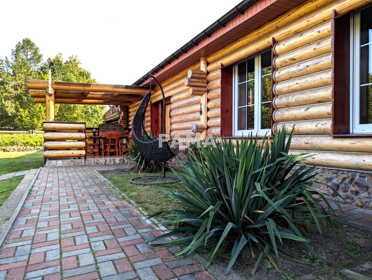 Działka 3921 mkw, przy drodze asfaltowej, w zabudowanej części starannie zagospodarowana, z zadbanym trawnikiem, z licznymi iglakami, krzewami, kwiatami, wokół domu utwardzona kostką brukową, na tarasach kamieniami, gresem, od drogi ogrodzona oryginalnym parkanem kamienno-drewnianym, zwiastującym artystycznego ducha całej nieruchomości. W niedalekim sąsiedztwie wolnostojąca zabudowa domami jednorodzinnymi, duże kompleksy leśne. Cisza i spokój.