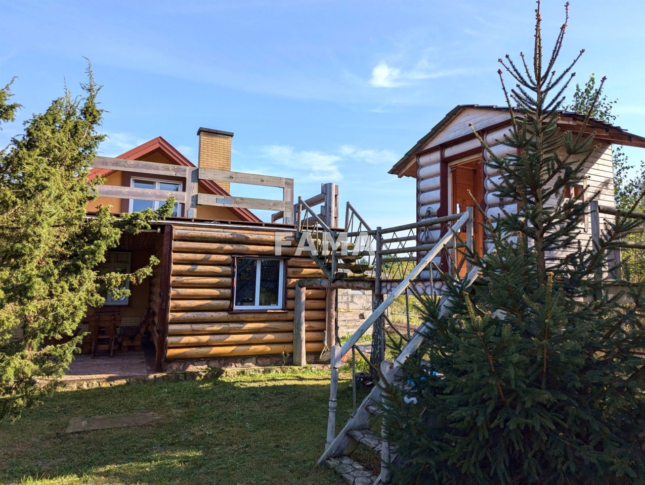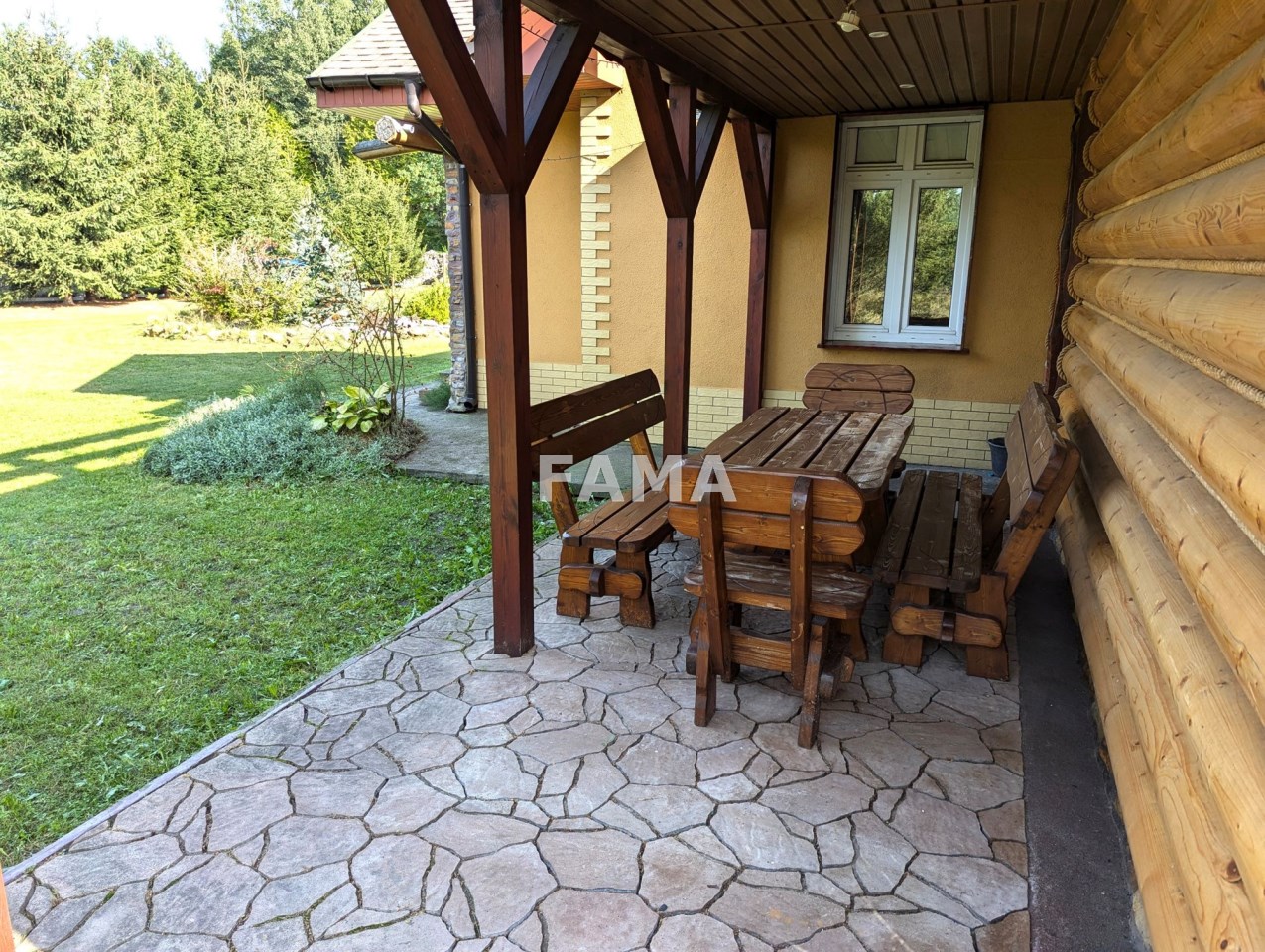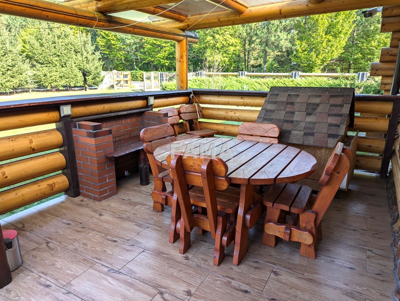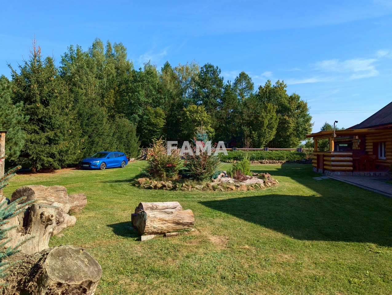 Działka 3921 mkw, przy drodze asfaltowej, w zabudowanej części starannie zagospodarowana, z zadbanym trawnikiem, z licznymi iglakami, krzewami, kwiatami, wokół domu utwardzona kostką brukową, na tarasach kamieniami, gresem, od drogi ogrodzona oryginalnym parkanem kamienno-drewnianym, zwiastującym artystycznego ducha całej nieruchomości. W niedalekim sąsiedztwie wolnostojąca zabudowa domami jednorodzinnymi, duże kompleksy leśne. Cisza i spokój.