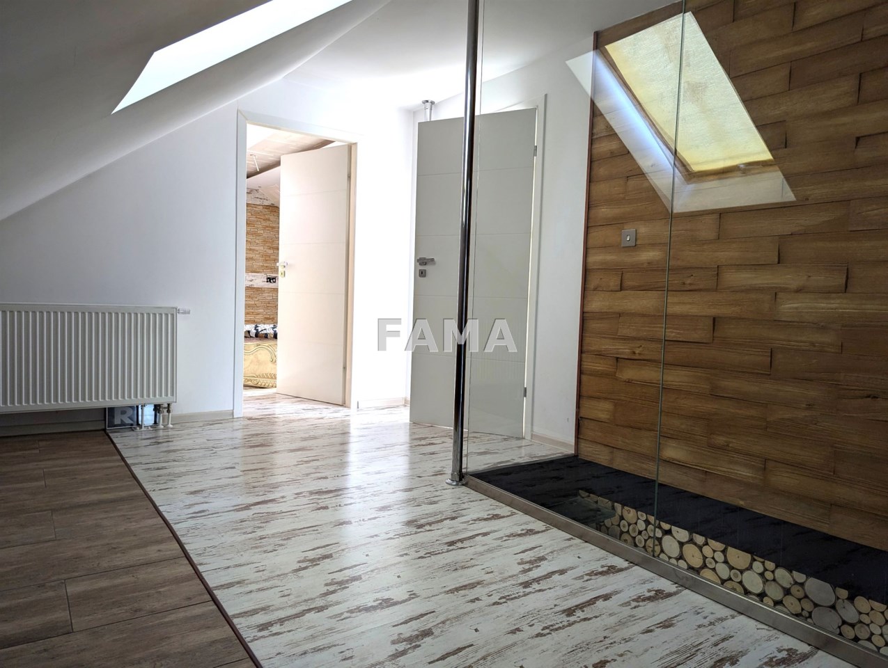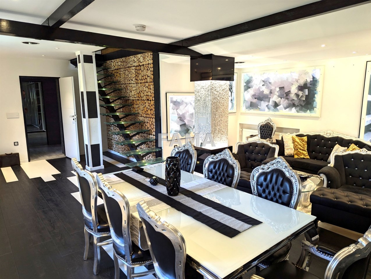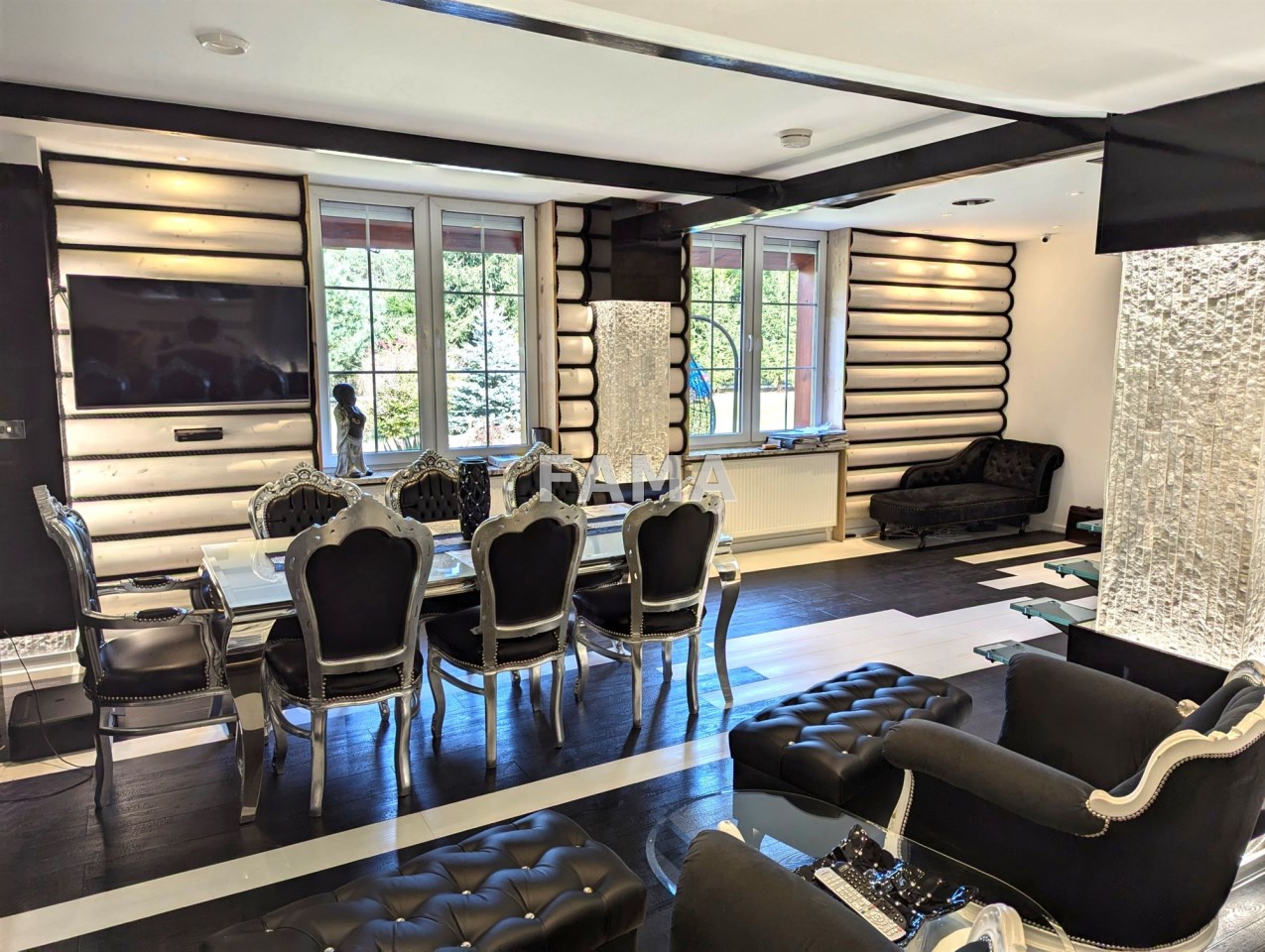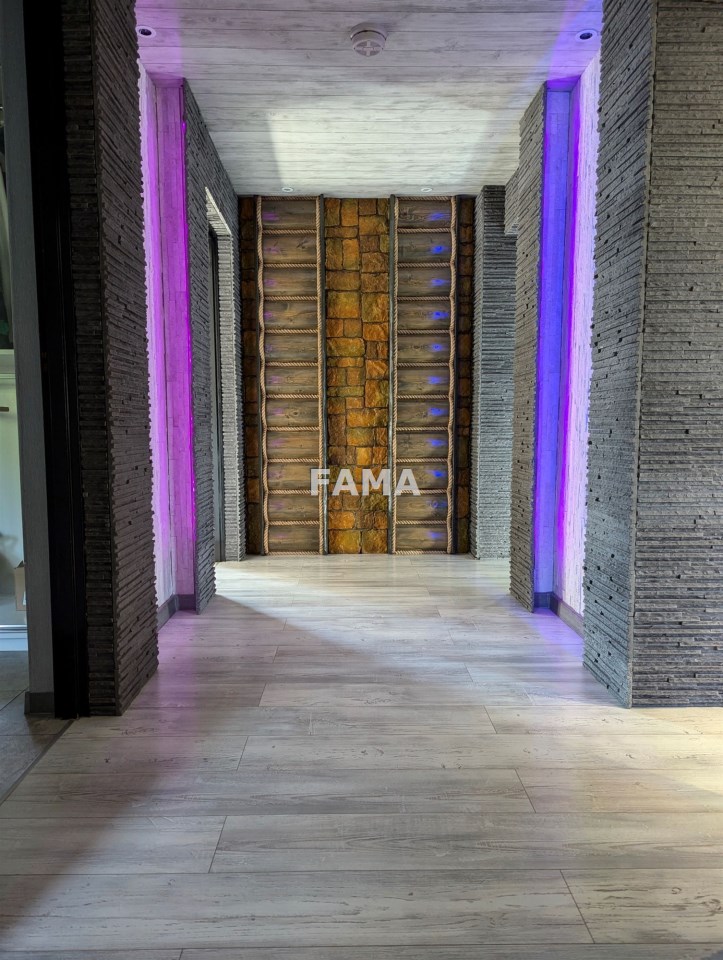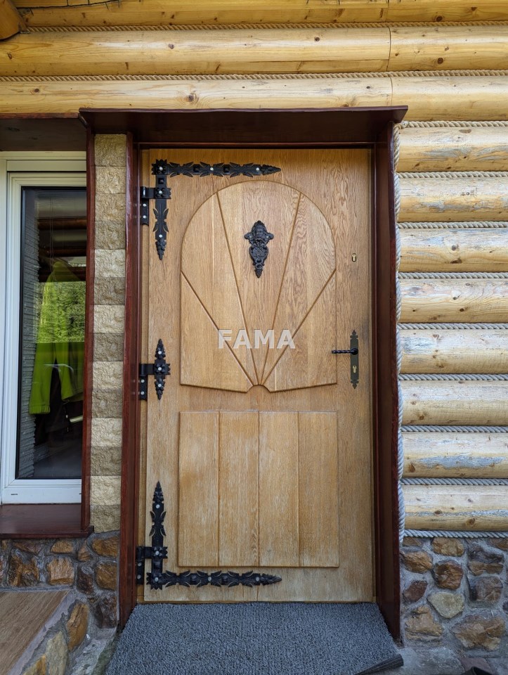 Okna PCW z podwójnymi szybami, z roletami antywłamaniowymi na parterze i na poddaszu od strony tarasu, drzwi drewniane dębowe, na podłodze panele, w salonie w większej części drewniane, gres szkliwiony, podwieszane sufity, w łazience, gres a`la czarny marmur, wanna narożna, muszla wisząca, super nowocześnie urządzony aneks kuchenny wraz ze sprzętem – całe wykończenie to artystyczna wizja, jak z marzeń sennych, w których mieszają się epoki, kraje i style, kolory, użyte materiały, nic tu nie jest zwyczajne, wszystko jednak zaprojektowane dla wygody i komfortu mieszkańców, na przykład pół-inteligentny system oświetleniowy, łazienka z radiem, głośnikami, telewizorem, na poddaszu pokój kinowy z opuszczanym elektrycznie projektorem, liczne zabudowy, efektowne podświetlenia…