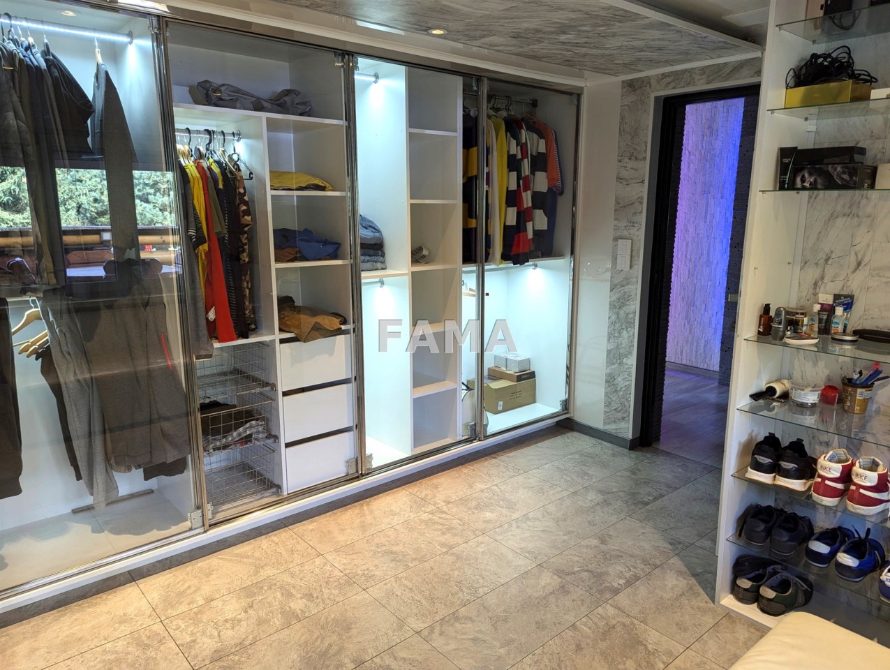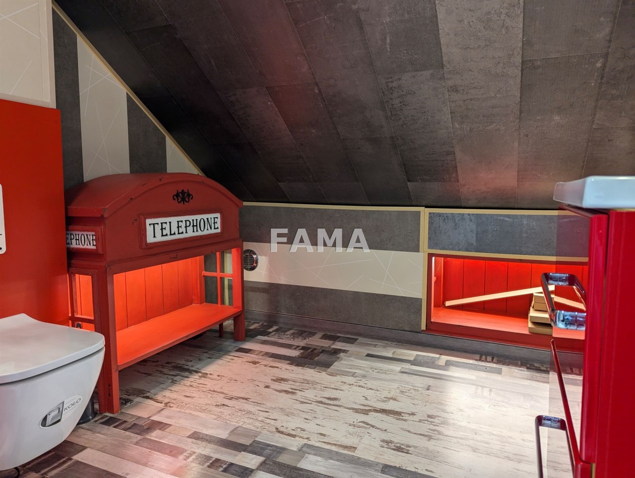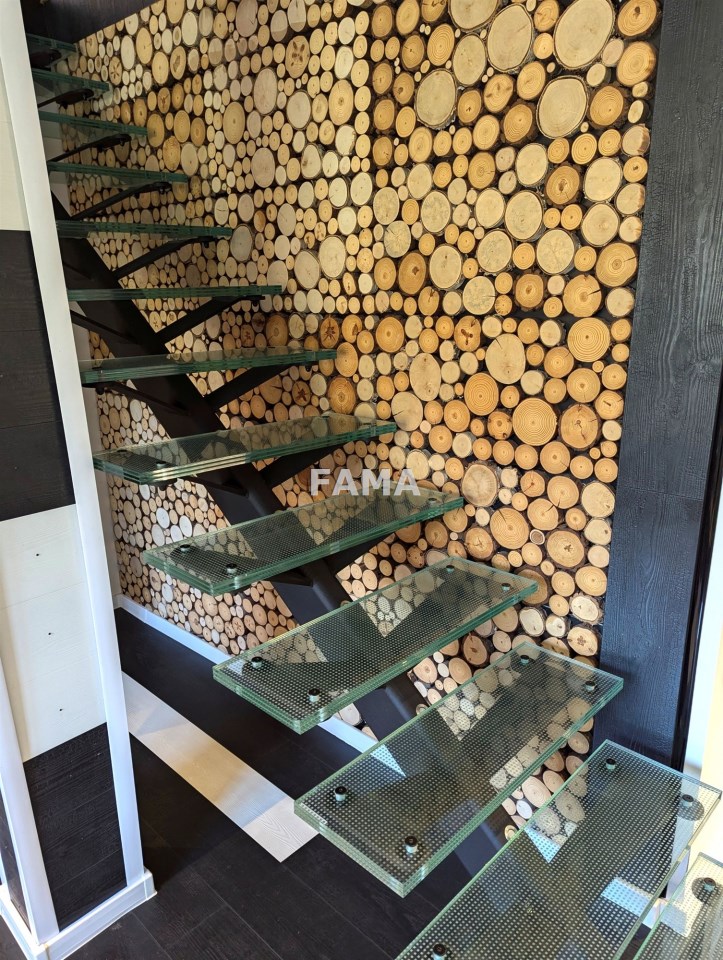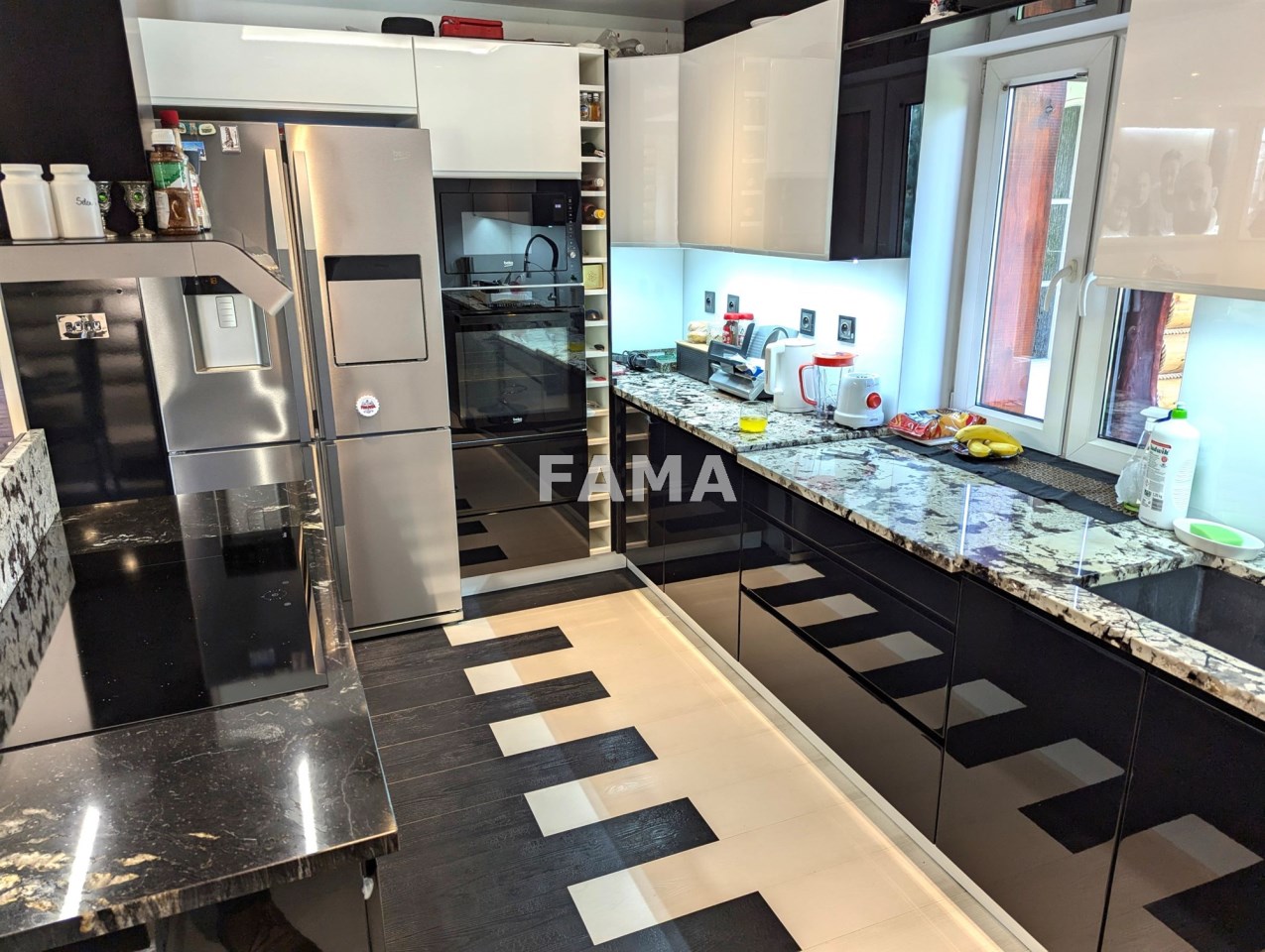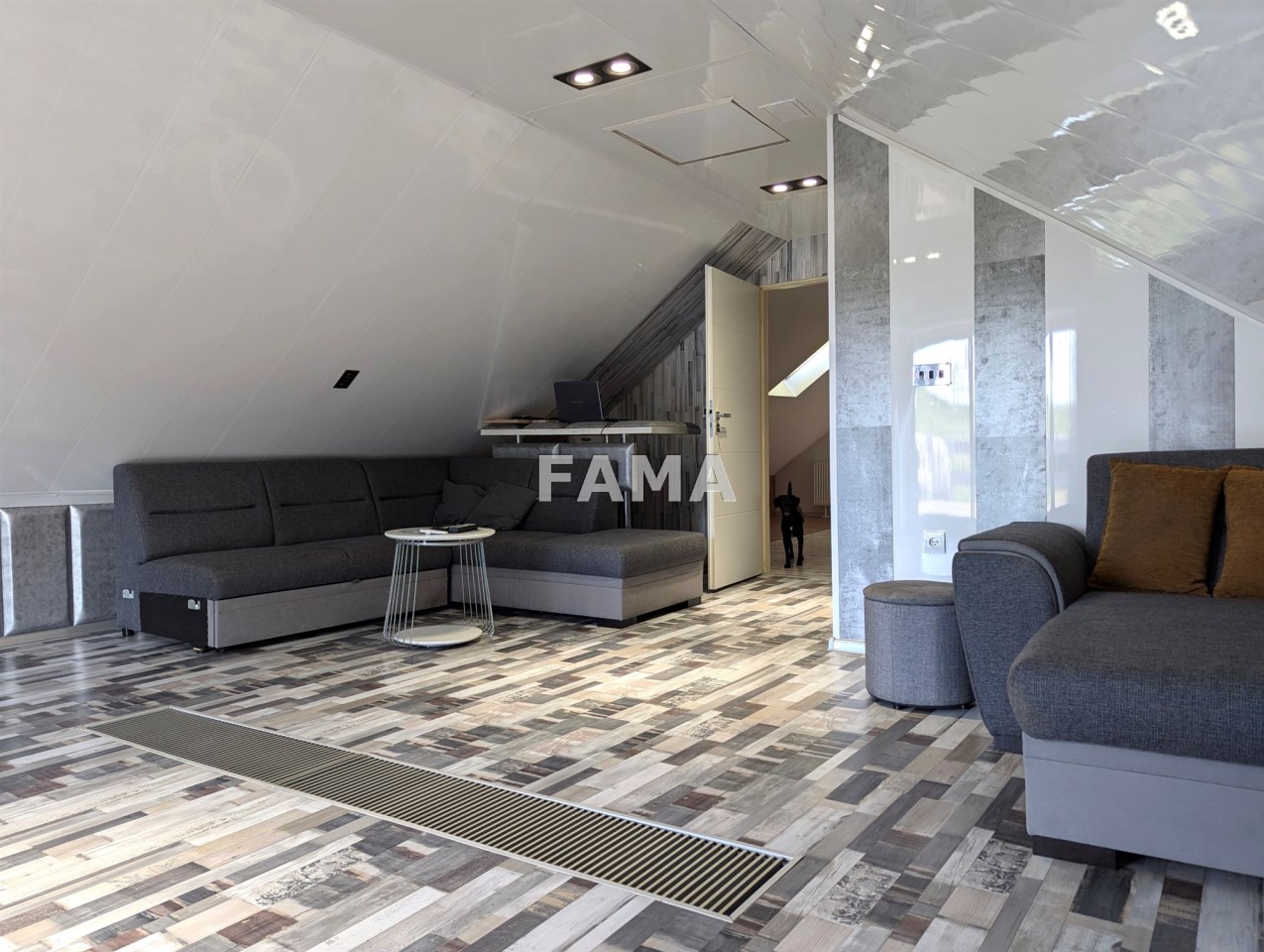 Okna PCW z podwójnymi szybami, z roletami antywłamaniowymi na parterze i na poddaszu od strony tarasu, drzwi drewniane dębowe, na podłodze panele, w salonie w większej części drewniane, gres szkliwiony, podwieszane sufity, w łazience, gres a`la czarny marmur, wanna narożna, muszla wisząca, super nowocześnie urządzony aneks kuchenny wraz ze sprzętem – całe wykończenie to artystyczna wizja, jak z marzeń sennych, w których mieszają się epoki, kraje i style, kolory, użyte materiały, nic tu nie jest zwyczajne, wszystko jednak zaprojektowane dla wygody i komfortu mieszkańców, na przykład pół-inteligentny system oświetleniowy, łazienka z radiem, głośnikami, telewizorem, na poddaszu pokój kinowy z opuszczanym elektrycznie projektorem, liczne zabudowy, efektowne podświetlenia…