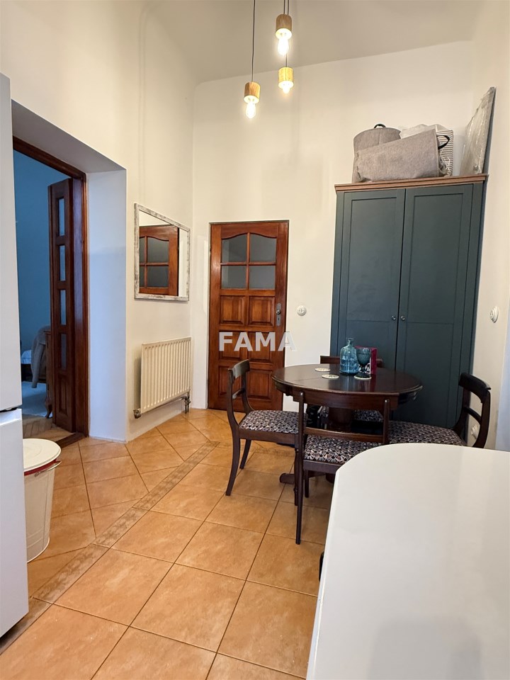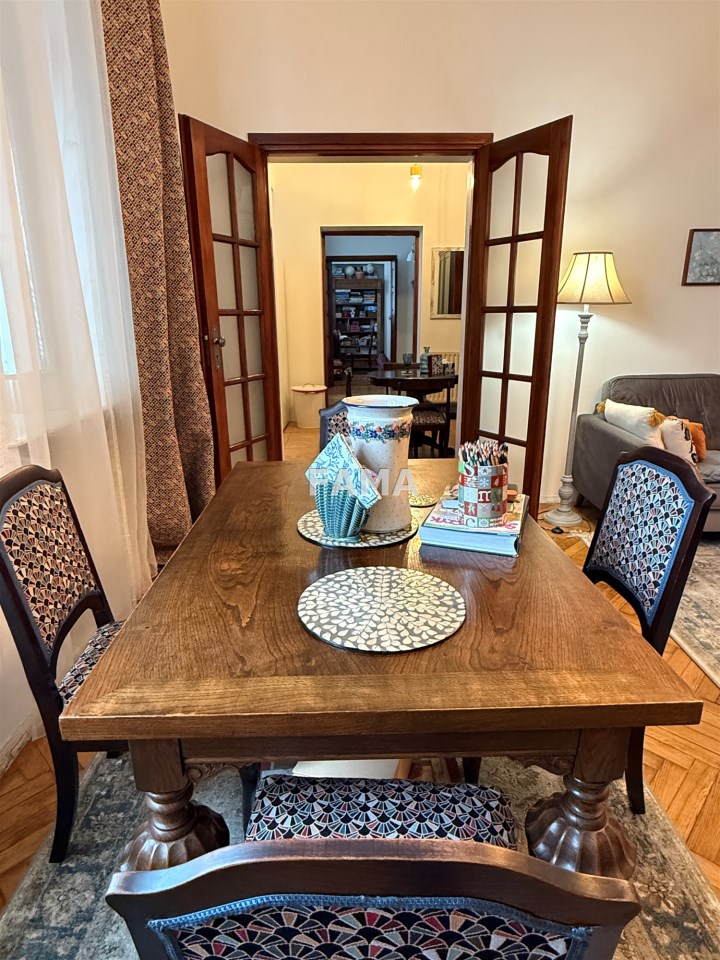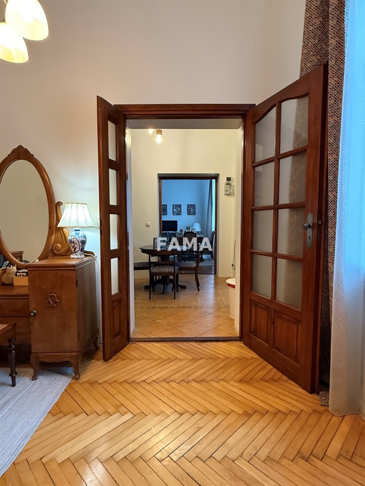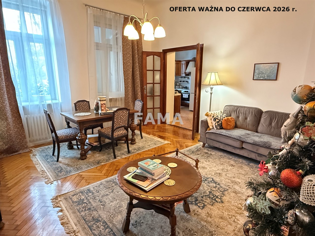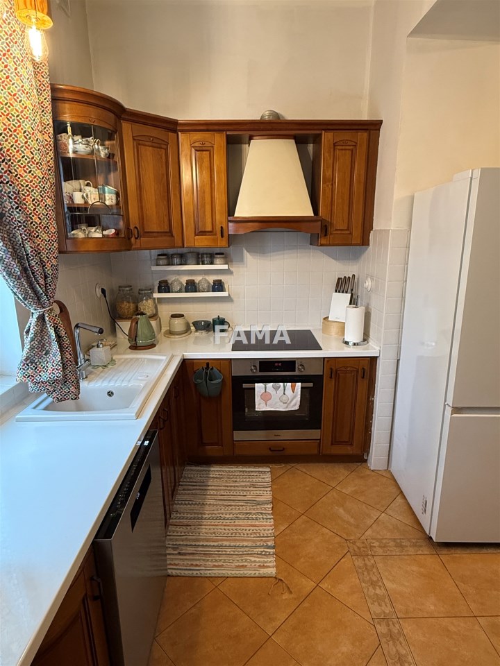 Aranżacja mieszkania cechuje się wysokim poziomem spójności i estetycznej harmonii, styl mieszkania podkreślają: szerokie, stylowe odrestaurowane drzwi między poszczególnymi pomieszczeniami, długie firany i zasłony gobelinowe, nowe żyrandole oraz śliczne porcelanowe włączniki, ciepłe przestrzenne, o wysokości 3,47 m, salon o powierzchni 23,28 mkw, dwa pokoje 15,32 i 14,82 mkw, jasna kuchnia, połączona z hallem 15 mkw, łazienka z WC 4,74 mkw, ganek 2,99 mkw, wykończone w wysokim standardzie: okna PCW, w pokojach na podłodze parkiet, na ścianach i sufitach gładź, w łazience – glazura, terakota, w kuchni również płytki, zabudowa meblowa z nowym sprzętem AGD: płytą elektryczną, piekarnikiem, zmywarką, lodówką – wszystko w idealnym stanie, czyste, zadbane, dodatkowo zainstalowany filtr do wody pitnej. Na życzenie może pozostać umeblowanie. CO z lokalnej kotłowni, ciepła woda zimą z pieca CO, latem z bojlera elektrycznego, odpływ do kanalizacji gminnej.