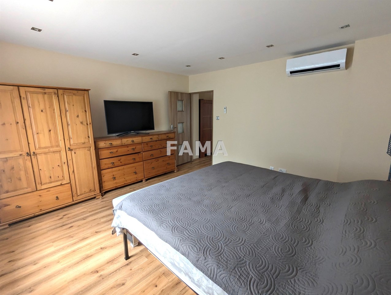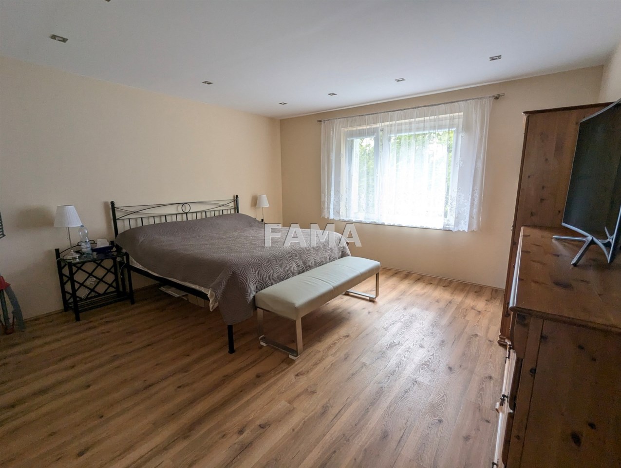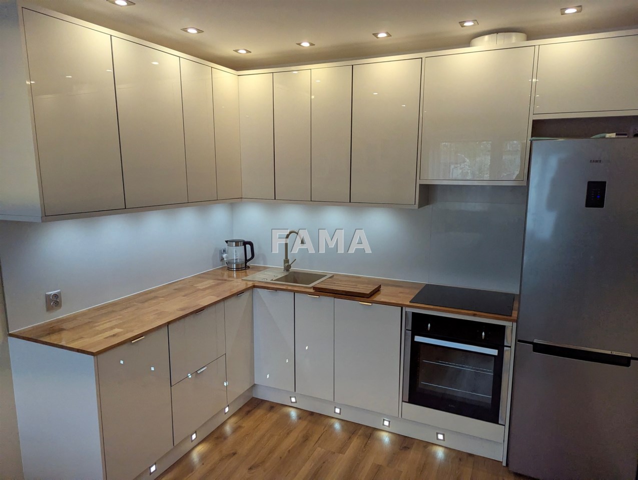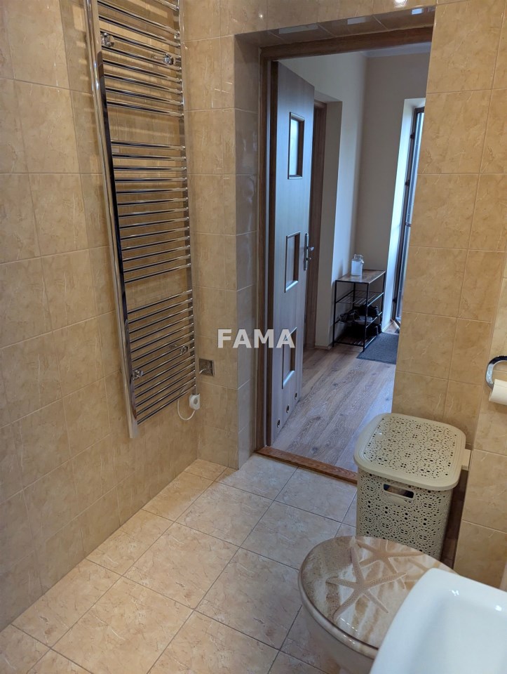 Nowe drzwi i ościeżnice, drzwi wejściowe antywłamaniowe, okna PCW z roletami materiałowymi, w pokojach na ścianach i sufitach płyty karton-gips i gładzie gipsowe, wszędzie sufity podwieszane z oświetleniem ledowym, na podłodze panele winylowe, w łazience jasna glazura, terakota, efektowne podświetlenia, podobnie podświetlona cała zabudowa kuchni - szafki górne i dolne wraz z kuchnią indukcyjną (na 220 V), zmywarką, lodówką.