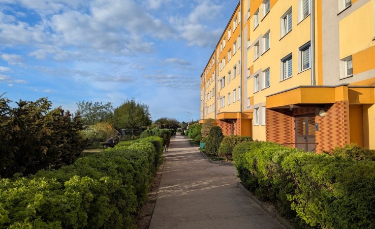 Z okien widoczna piękna panorama osiedla, otaczających bloki terenów zielonych, balsam dla zmęczonych, na przykład od pracy z komputerem, oczu.