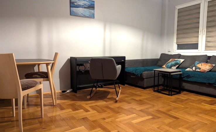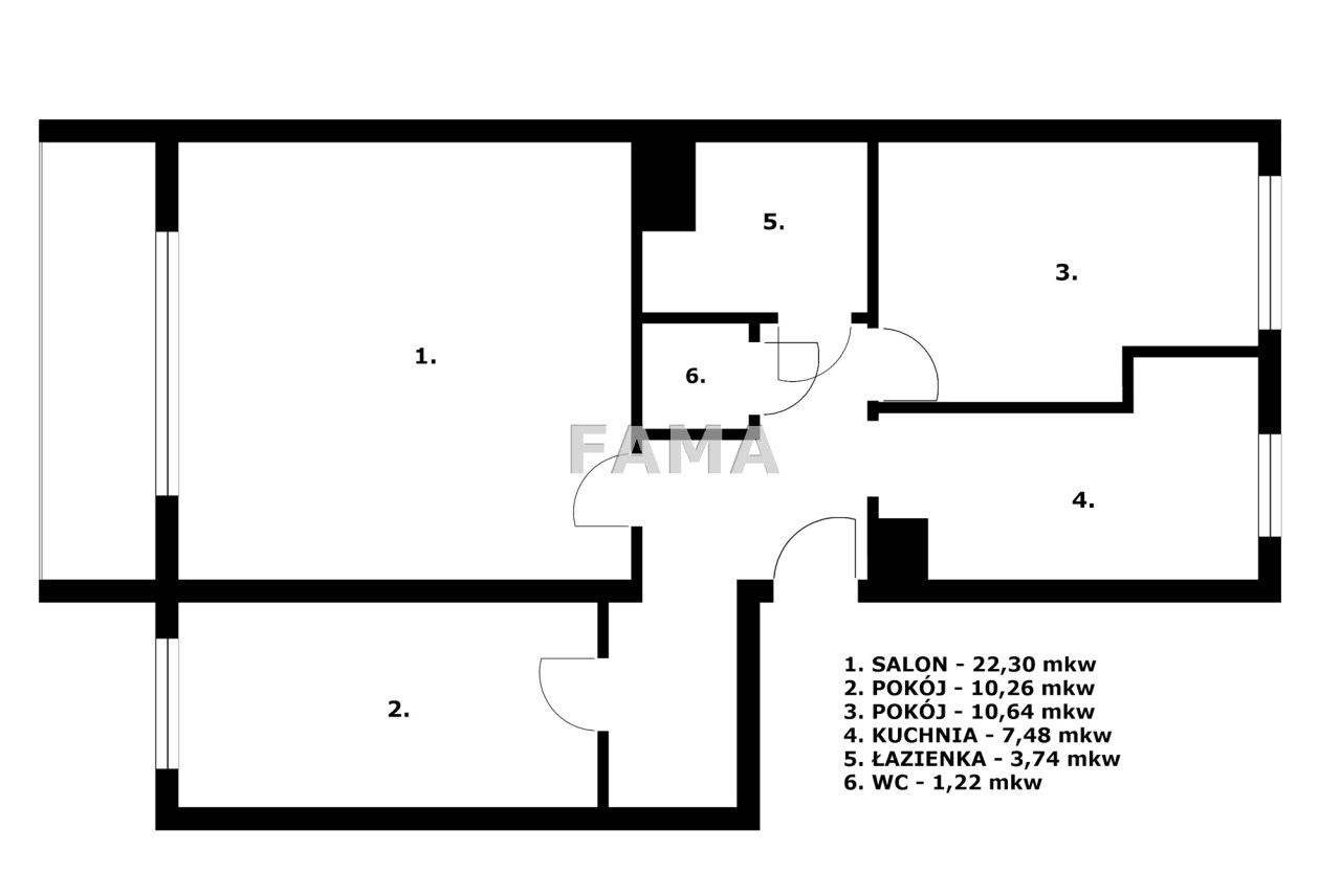 Praktyczny rozkład pomieszczeń: pokój dzienny o powierzchni 22,30 mkw, dwa mniejsze - 10,64 mkw i 10,26 mkw, kuchnia, z wygospodarowaną wnęką na lodówkę - 7,48 mkw, łazienka, w której mieści się kabina prysznicowa i jednocześnie wanna – 3,74 mkw, WC – 1,22 mkw, duży przedpokój.