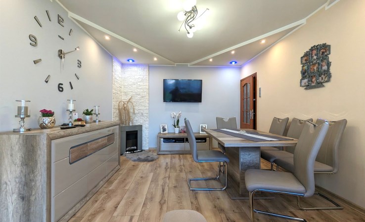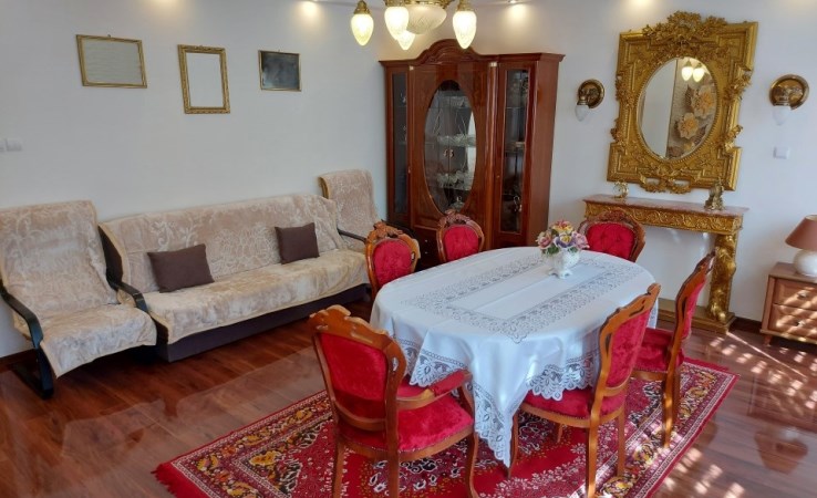Na podłodze gres, na ścianach częściowo glazura, częściowo tynk ozdobny i gładź, okna PCW z żaluzjami pionowymi i poziomymi, klimatyzacja. CO z sieci miejskiej, telewizja kablowa, internet.