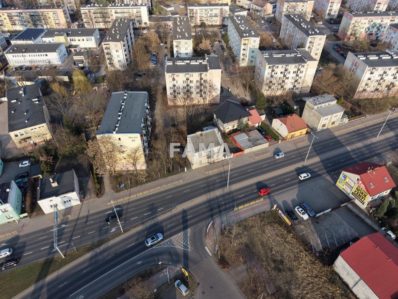 Dom piętrowy o powierzchni 124,42 mkw + dostawiony do tylnej ściany garaż murowany o powierzchni 16 mkw, położony w Centrum Włocławka, przy ul. Okrzei, wybudowany z cegły Bojańczyka w 1937 r., w połowie podpiwniczony, z dachem jednospadowym, ze stropem betonowym między piwnicą a parterem i drewnianym nad parterem.