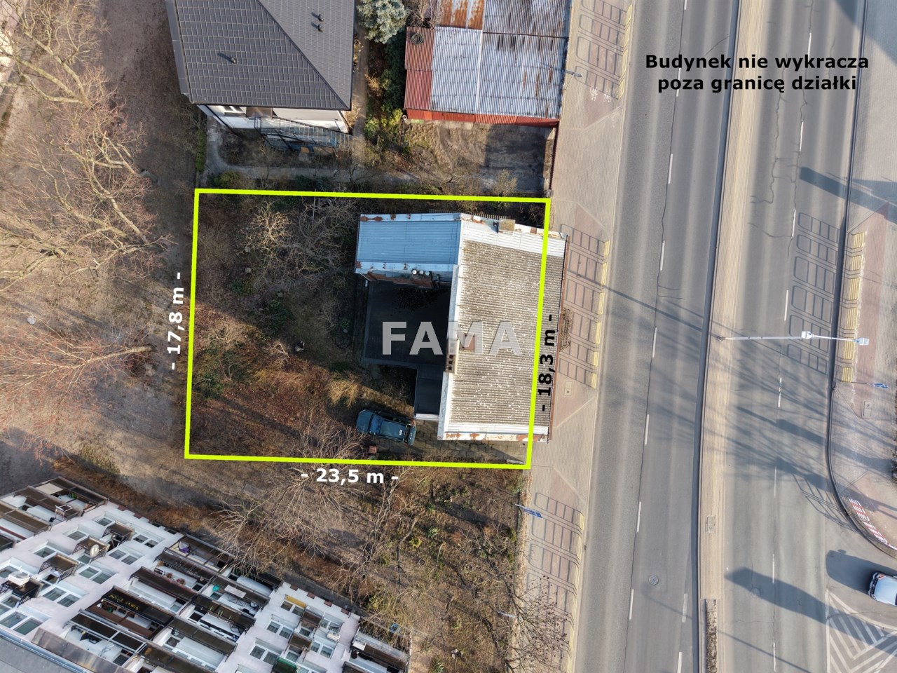 Działka 422 mkw, ogrodzona siatką, z kilkoma dużymi drzewami, przy ruchliwej drodze asfaltowej, idealny punkt na różnego rodzaju działalność gospodarczą.