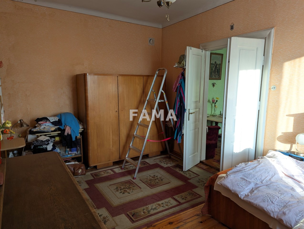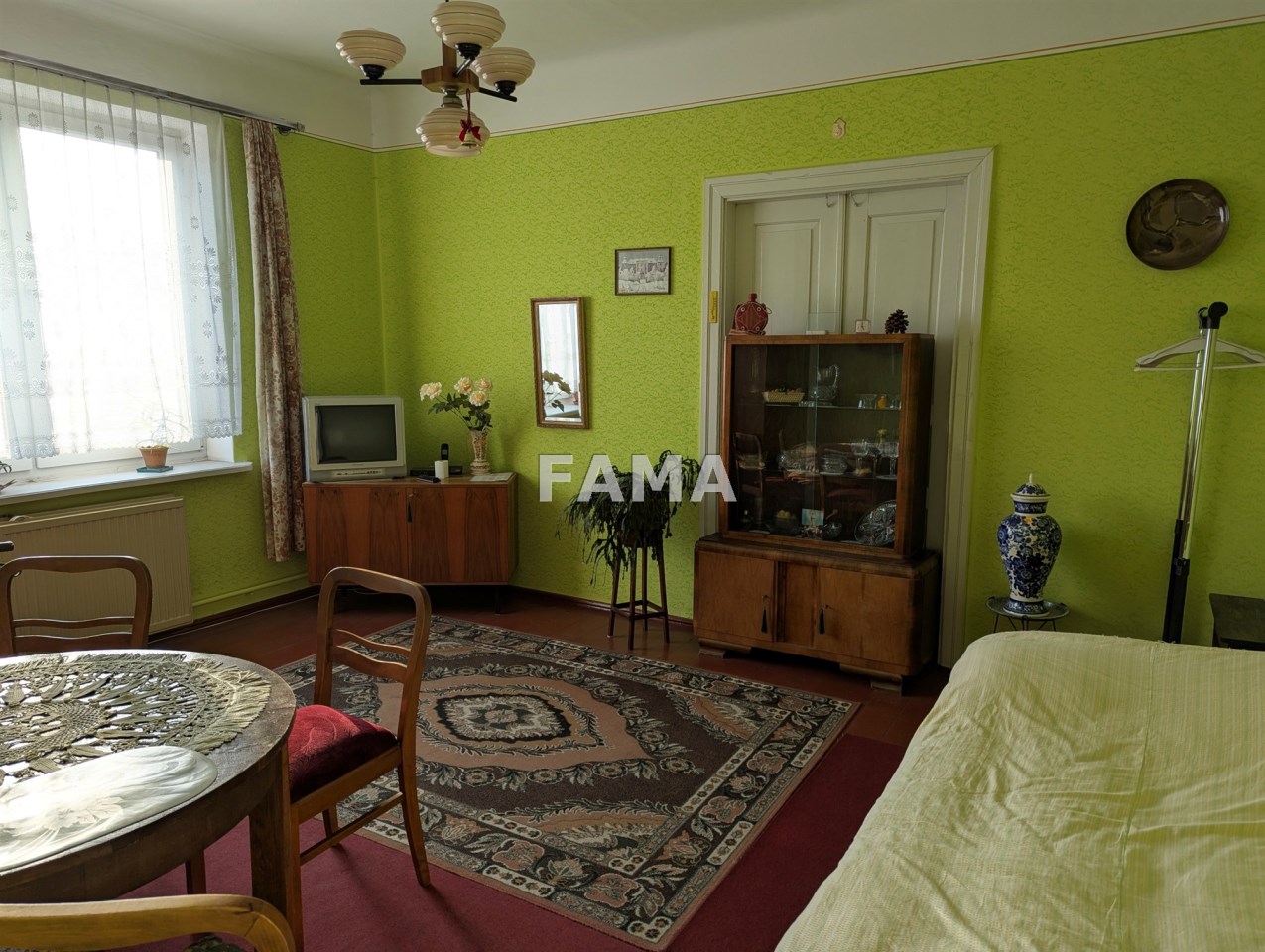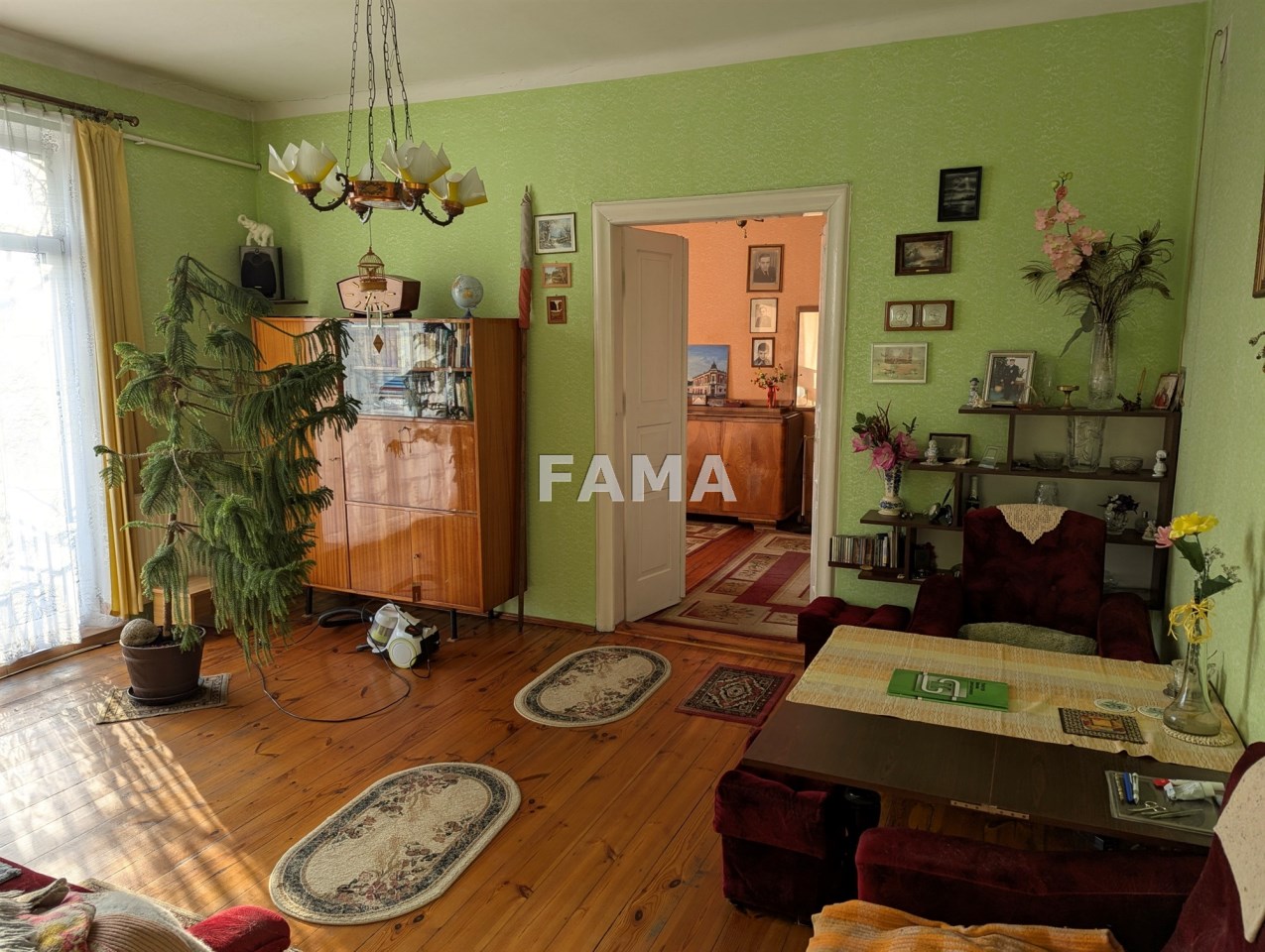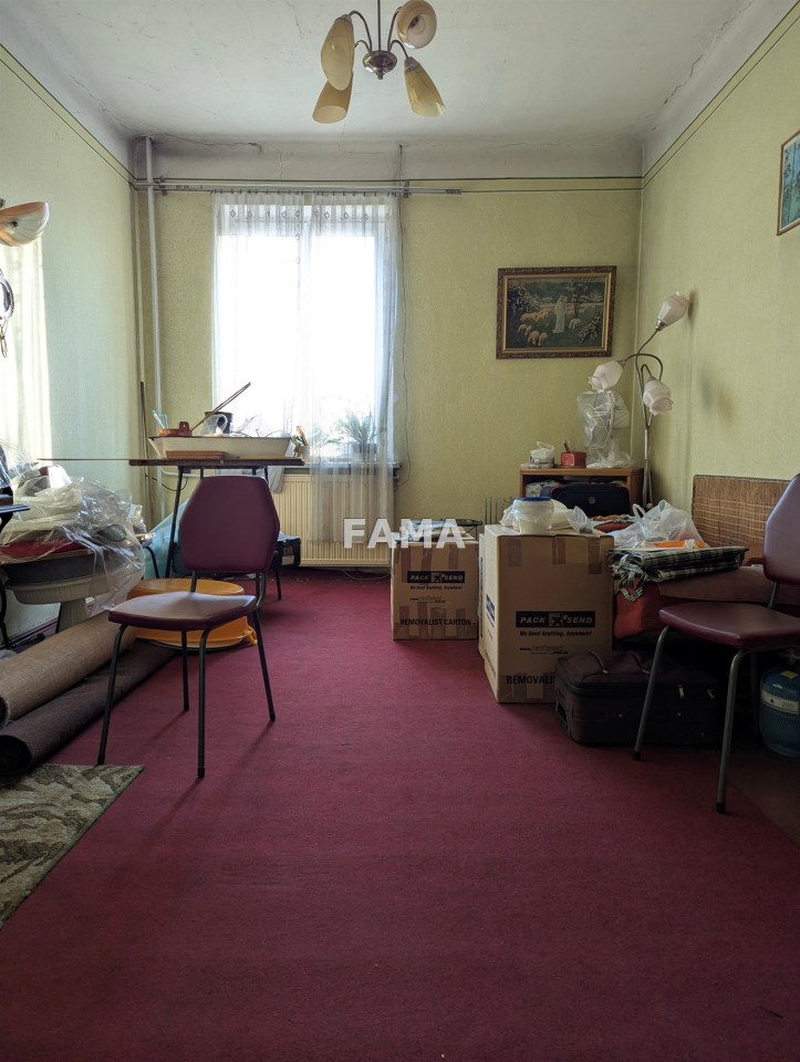 Na parterze o wysokości 3 m: duży pokój o powierzchni 19,97 mkw, mniejszy - 17,52 mkw, kuchnia z wydzielonym prysznicem – 9,40 mkw, dwa przedpokoje - 9,23 mkw i 3,91 mkw (w tym WC), klatka schodowa 10,85 mkw. Na piętrze – pomieszczenia wysokie na 3,04 m: dwa pokoje 20,11 mkw i 17,47 mkw, kuchnia 8,26 mkw, łazienka (z oknem) 2,71 mkw i przedpokój – 1,95 mkw.